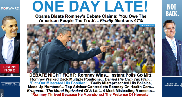 Building on that narrative, Obama’s campaign quickly released an ad questioning Romney’s truthfulness, arguing that he didn’t level with middle-class families on how his tax plan would affect them. “If we can’t trust him here, how could we ever trust him here?” the ad says. It was airing in Colorado, Florida, Iowa, New Hampshire, Nevada, Ohio and Virginia.